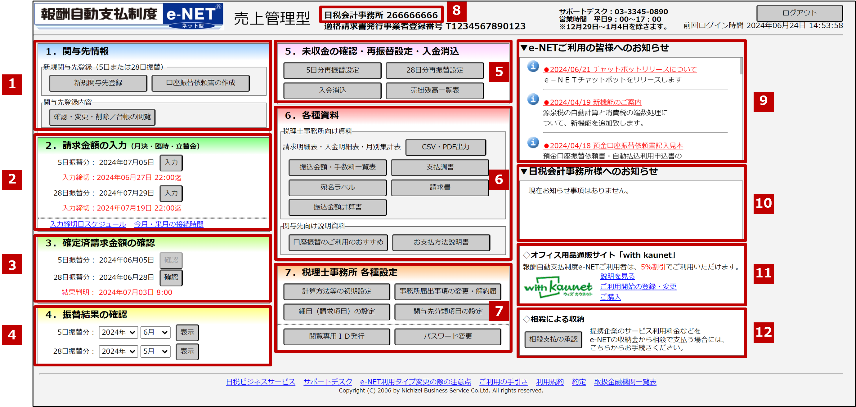 | 利用者名・ユーザー番号・適格請求書発送事業者登録番号 | e-NET売上管理型の利用者名、ユーザー登録番号、適格請求書発送事業者登録番号が表示されます。 サポートデスク問い合わせ時にはユーザー登録番号を伝えてください。 |