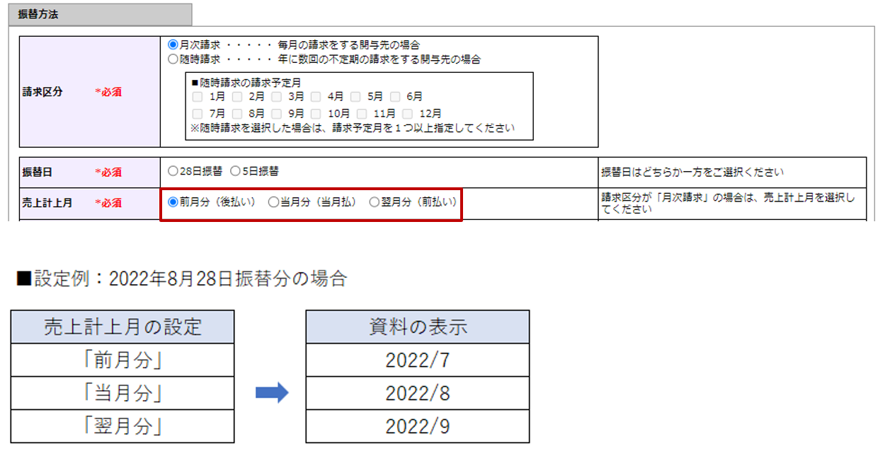 | 振替開始月 | 直近3カ月先の振替開始月が表示されます。[請求区分]欄で[月次請求]を選択した場合は、「振替開始月」を選択します。 [請求区分]欄で「随時請求」を選択した場合は、入力不要です。 |