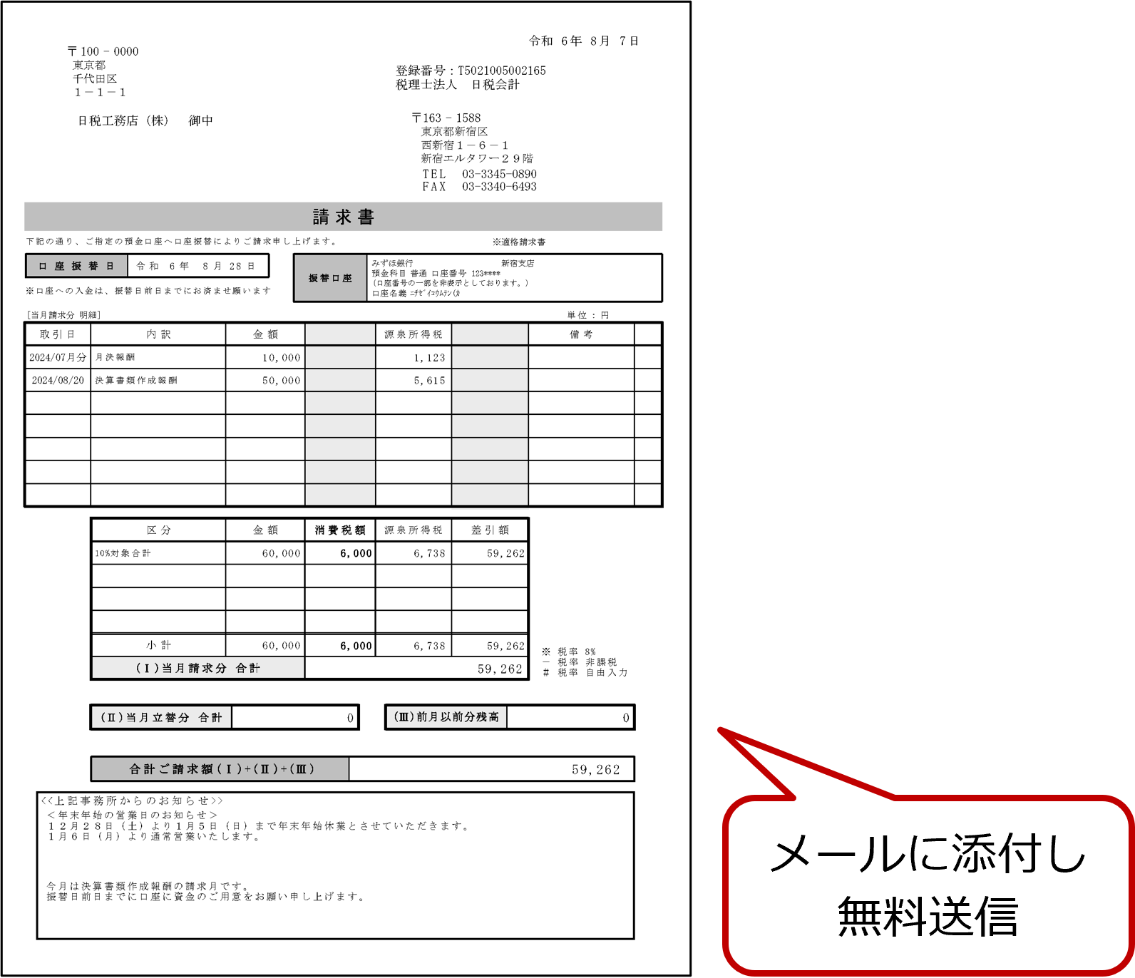 『請求書』メールは、無料で送信できます。メールにPDFファイルの『請求書』を添付し、締切日の翌日に送信されます。関与先宛メールが送信エラーとなった場合、税理士事務所宛にエラーメールが送信されます。