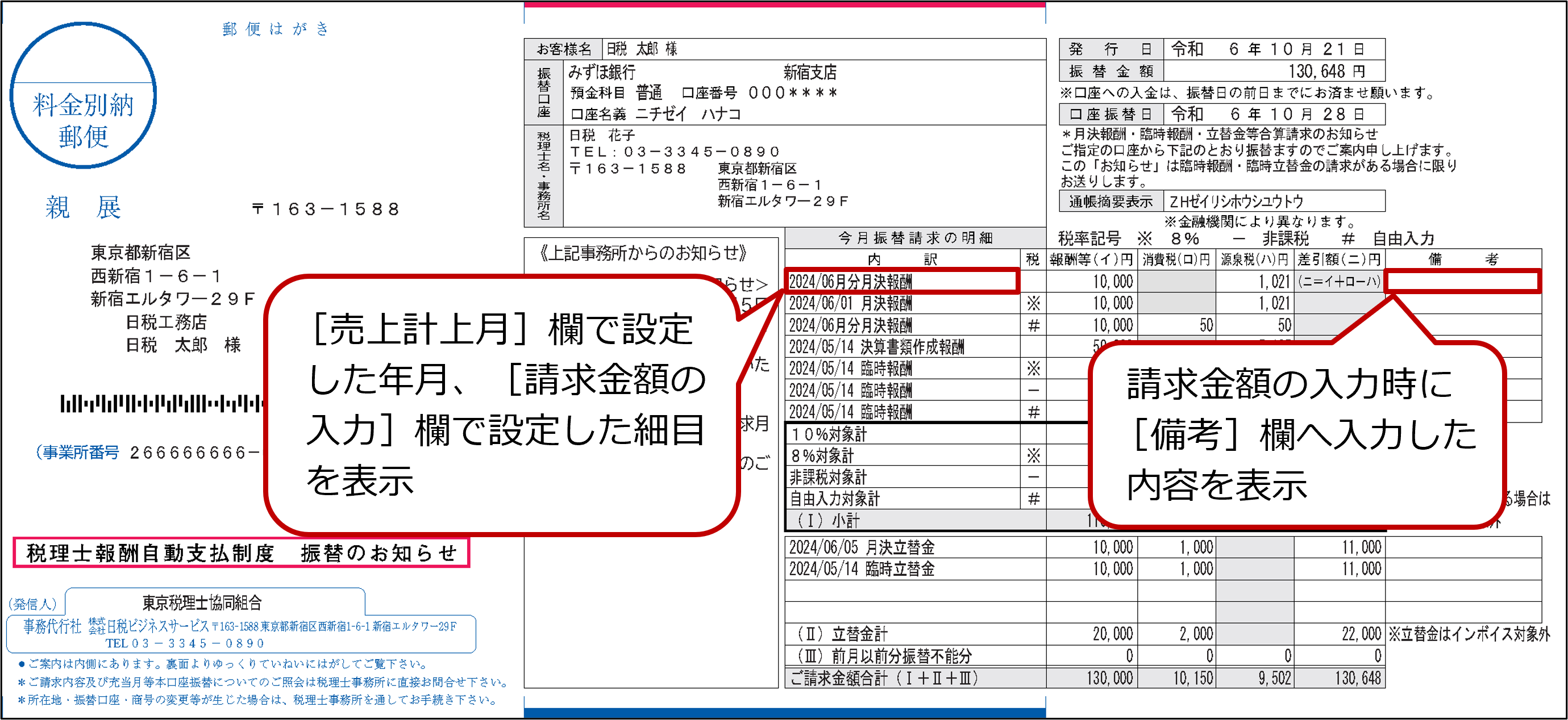 『請求書』メールまたは『振替のお知らせ』ハガキの送付区分を選択し、関与先に請求金額を事前にお知らせできます。『請求書』は印刷し、関与先にお渡しすることもできます。詳細は「9.3 請求書一括出力」を参照してください。