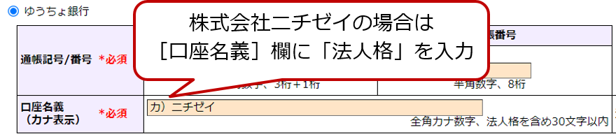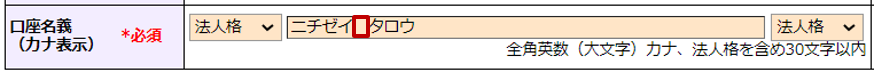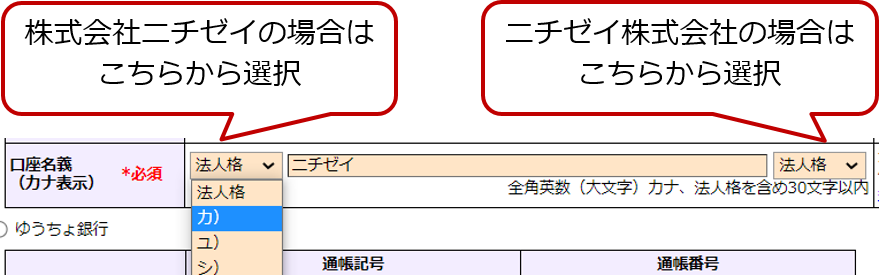 プルダウンメニューに該当の法人格がない場合は[口座名義]欄に「法人格」も入力します。