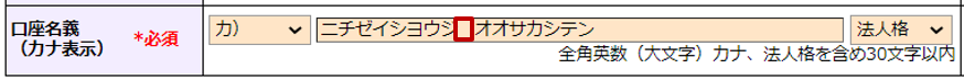 | 口座名義(カナ表示) | 法人の場合は、社名前後の「法人格」を選択し、口座名義(全角英カナ大文字、数字 30字以内)を入力します。肩書・代表者名の入力は不要です。 | ||