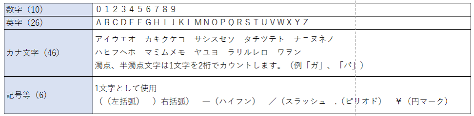 - ャ、ュ、ョなどのカナ小文字は使用不可。ヤ、ユ、ヨなどのカナ大文字を使用