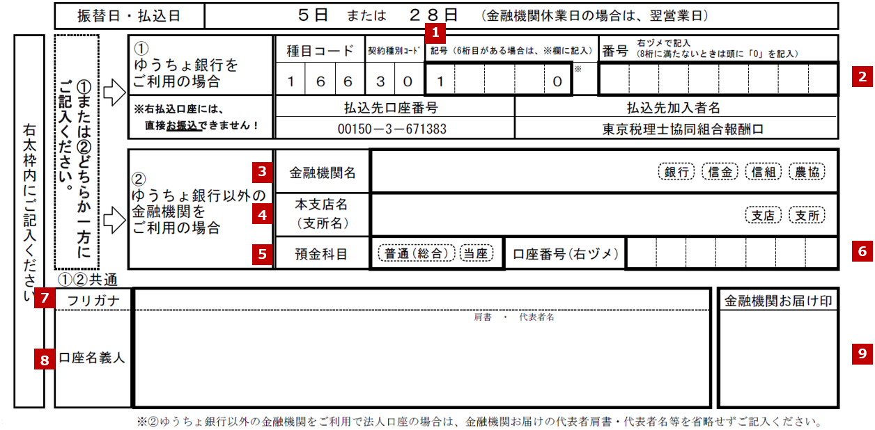 ・「ゆうちょ銀行」を指定する場合、1~2、7~9を記入します。