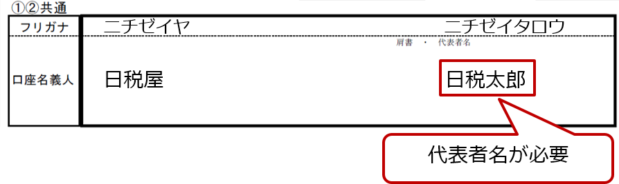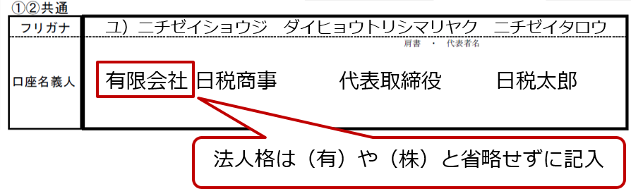 口座名義の漢字は、金融機関のお届け通りに記入します。金融機関の通帳には、肩書、代表者名の記載を省略している場合がありますが、必ず省略せずに記入してください。