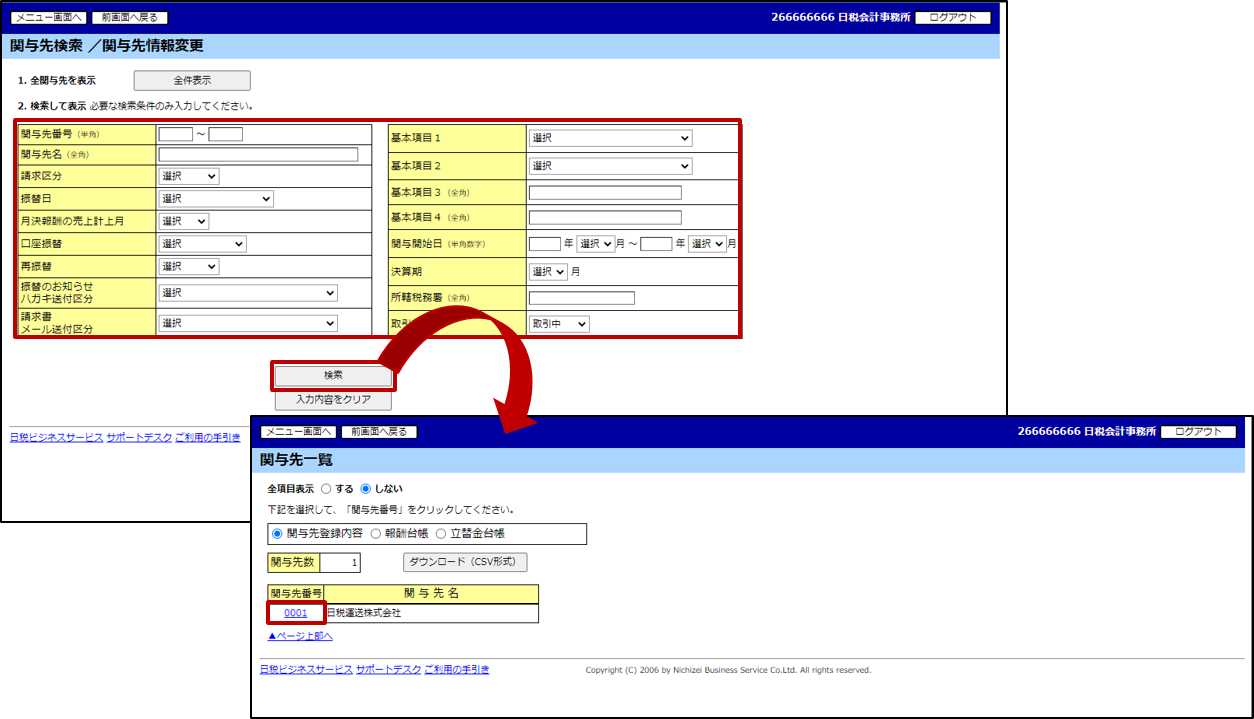登録済みの関与先情報を表示し、確認、変更、再登録できます。