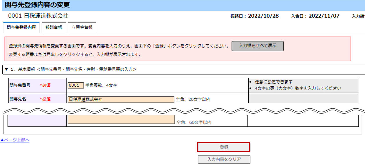 [関与先登録内容の変更]画面で関与先情報を変更し、[登録]ボタンをクリックします。