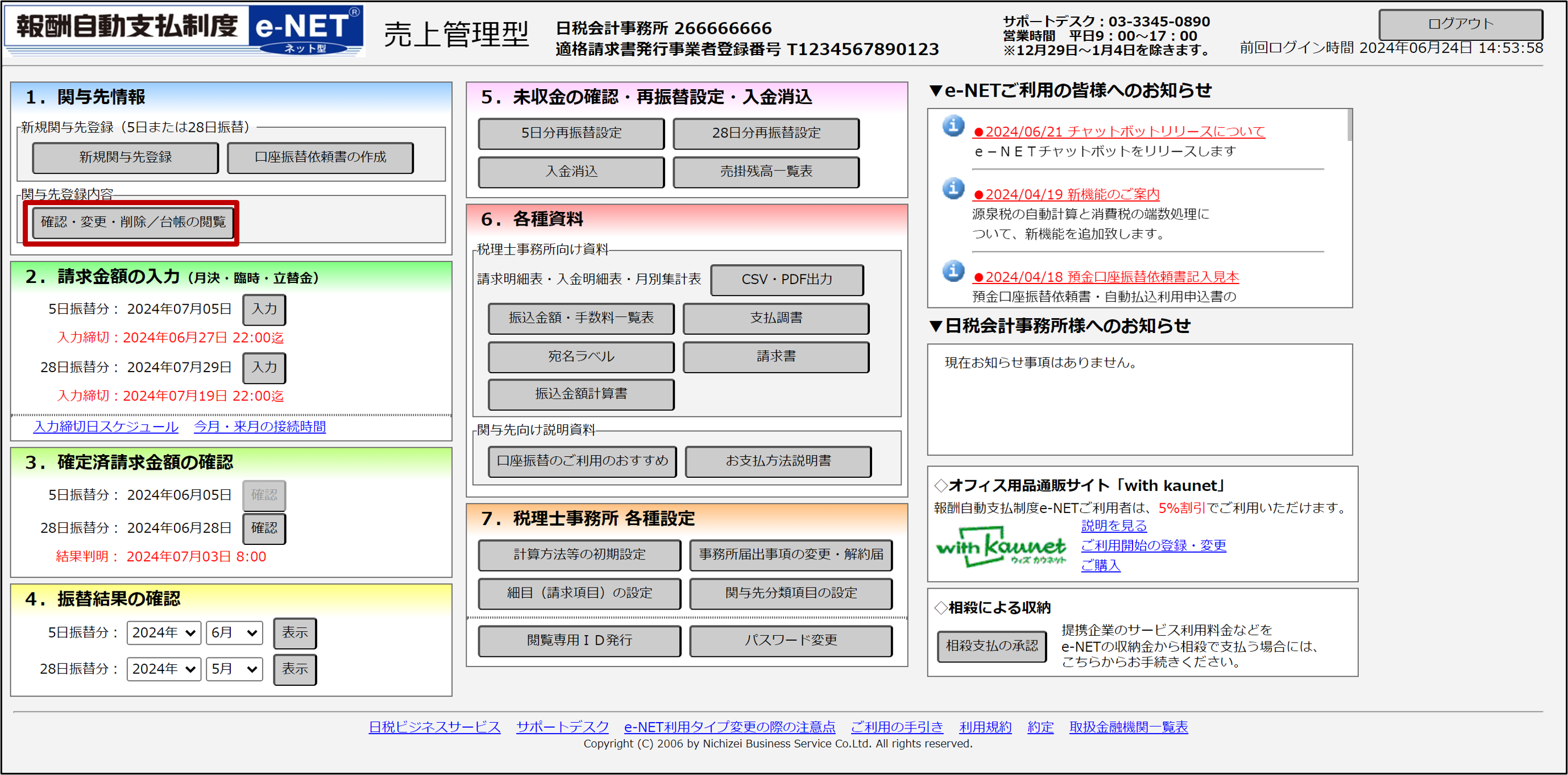 関与先情報変更の入力締切日は、振替日の6営業日前までです。それまでは何度でも変更できます。