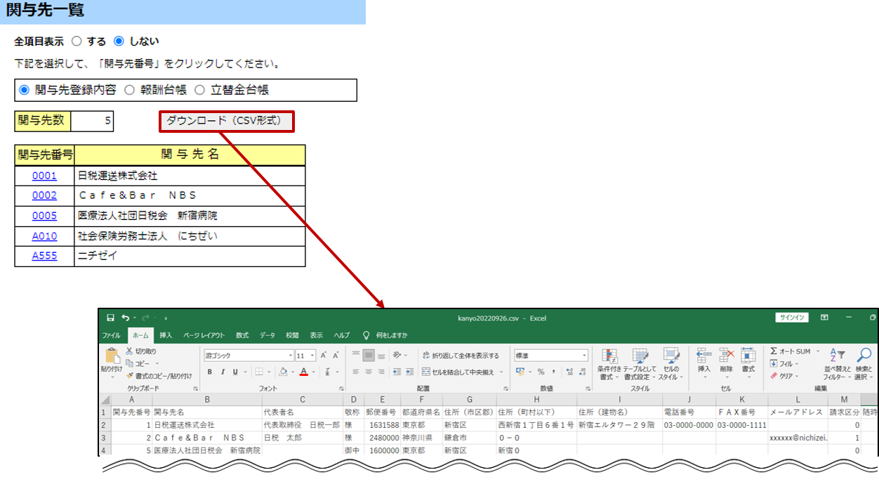 [関与先検索/関与先情報変更]画面で[ダウンロード(CSV形式)]ボタンをクリックすると、「関与先一覧」をCSV形式で出力できます。