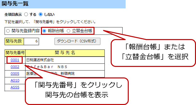 [関与先一覧]画面で「報酬台帳」または「立替金台帳」を選択し、「関与先番号」をクリックして、関与先の台帳を確認できます。詳細は「8.5 報酬台帳」または「8.6 立替金台帳」を参照してください。