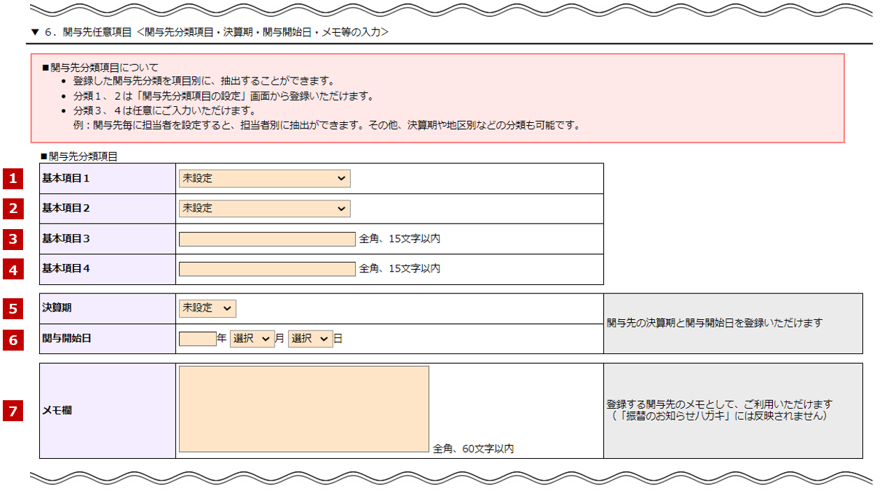 | 基本項目4 | 関与先の分類項目(全角、15字以内)を自由に入力できます。 | |