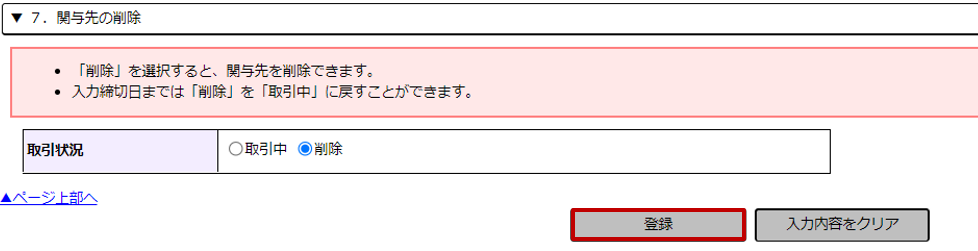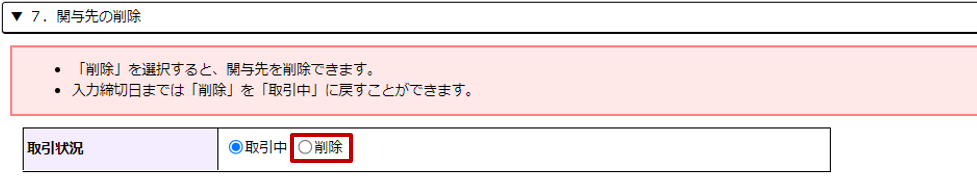 [関与先登録内容の変更]画面の[取引状況]欄で「削除」を選択します。