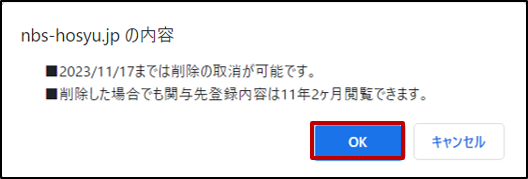 登録確認のメッセージが表示されます。[OK]ボタンをクリックします。入力締切日(振替日の6営業日前)に関与先が削除されます。