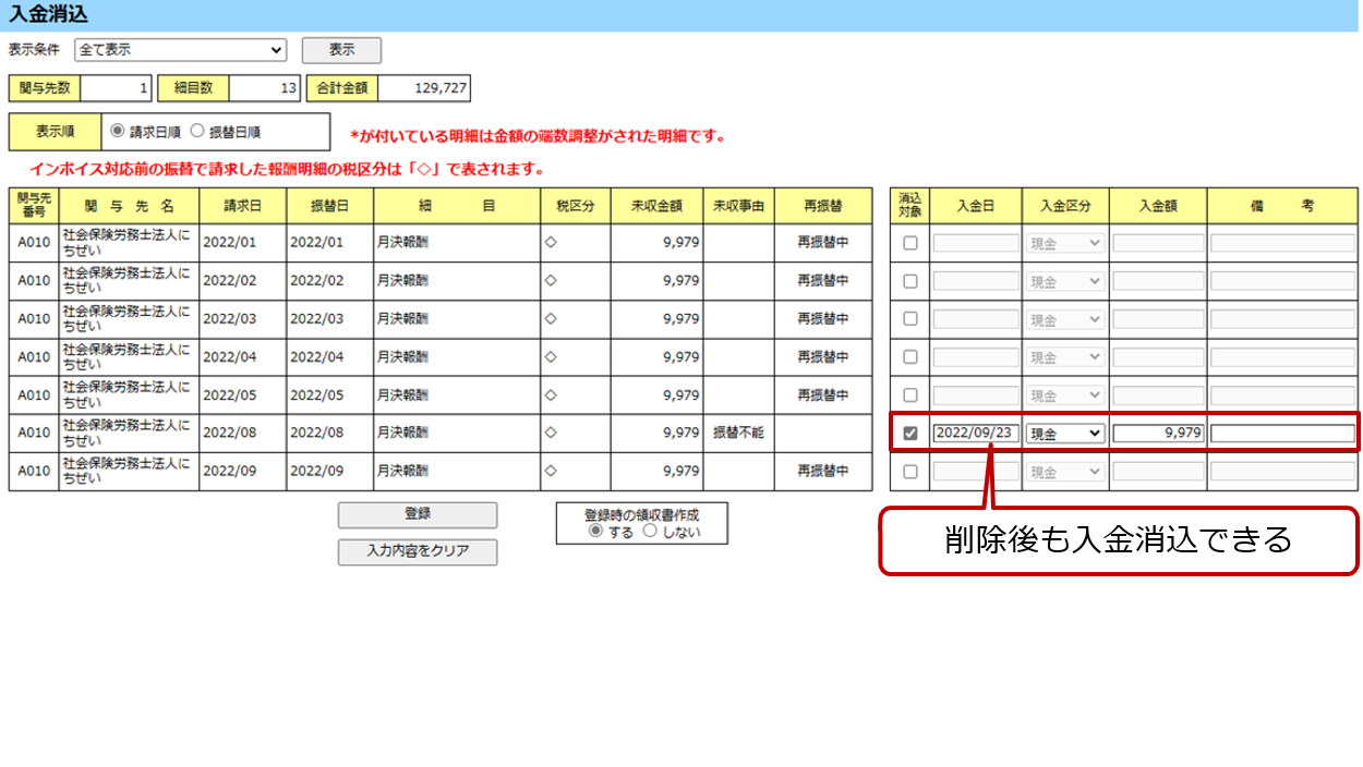 関与先の削除時に未収金がある関与先の場合、削除後もデータ保管期間の11年2カ月間は[入金消込]画面で入金消込ができます。詳細は「12.3 入金消込」を参照してください。