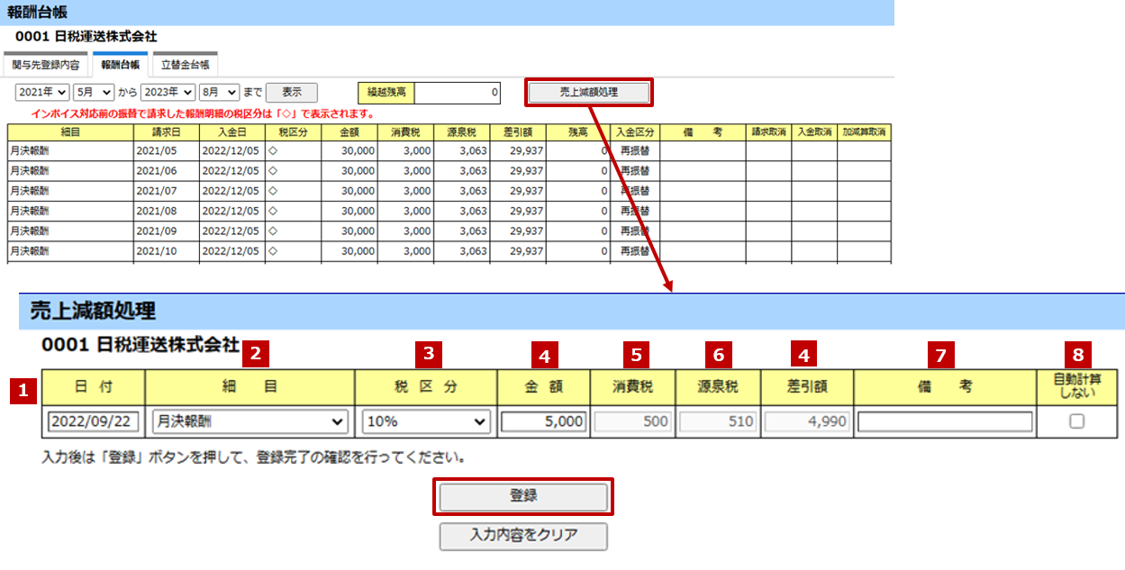[報酬台帳]画面で[売上減額処理]ボタンをクリックし、[売上減額処理]画面で減額内容を入力します。[登録]ボタンをクリックすると、減額内容が登録できます。