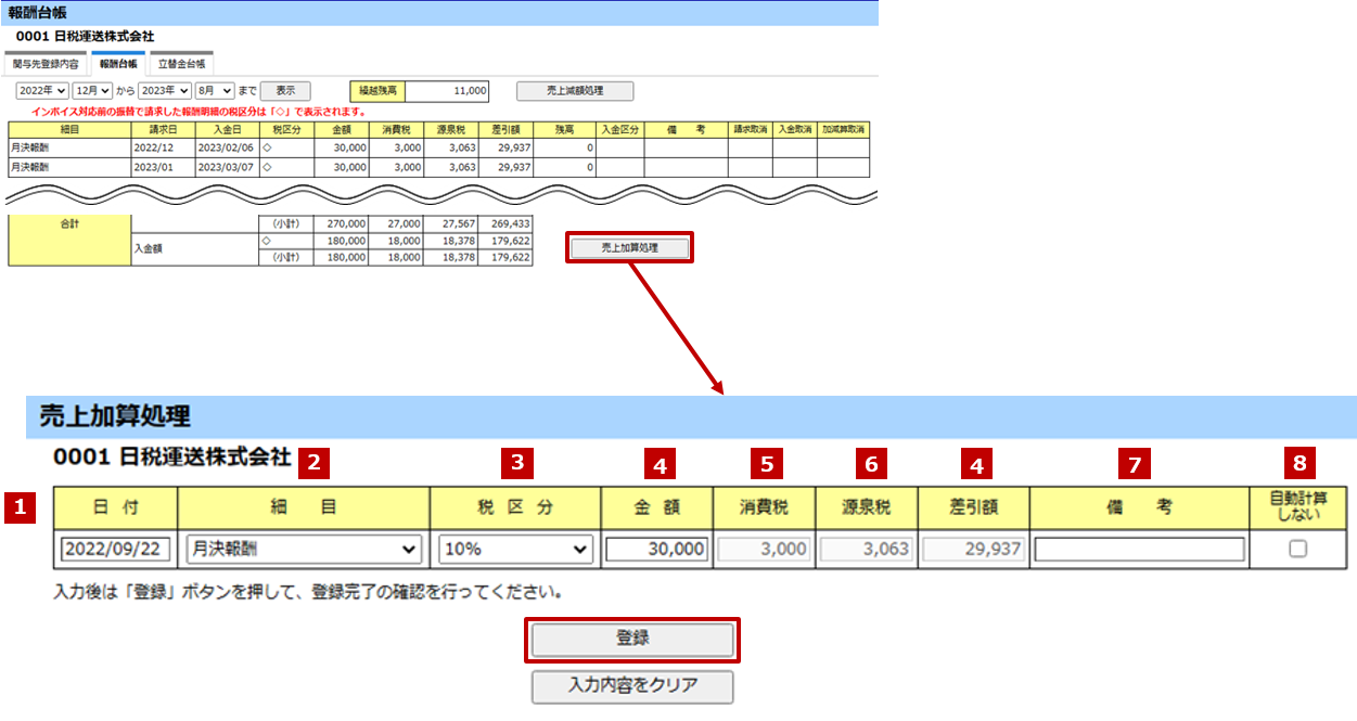 [報酬台帳]画面で[売上加算処理]ボタンをクリックし、[売上加算処理]画面で、加算内容を入力します。[登録]ボタンをクリックすると、加算内容が登録できます。