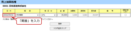 e-NET利用開始前の売上を登録する場合、[日付]欄に「期首」を入力します。加算入力した売上は、11年2カ月経過すると、自動的に抹消されます。
