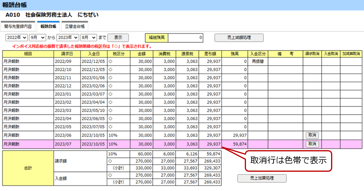 売上減額や加算処理の入力の取消ができます。 [報酬台帳]画面で、[加減算取消]欄の[取消]ボタンをクリックすると、取消行が色帯に変わり、メッセージが表示されます。内容を確認し[OK]ボタンをクリックすると、売上減額処理・売上加算処理の取消ができます。請求と入金が一括で取消されます。