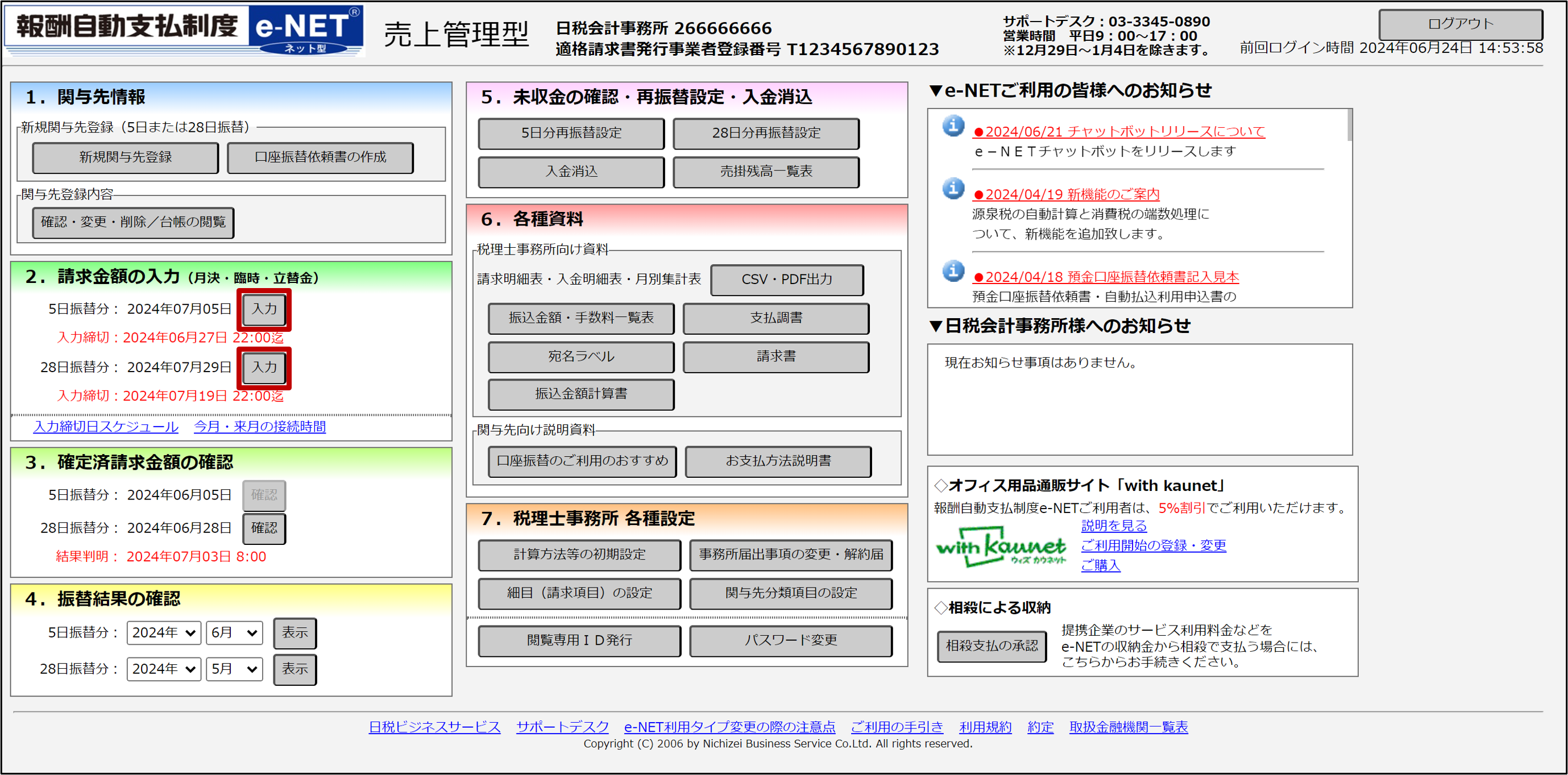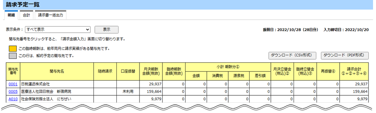「請求予定一覧」で関与先ごとの請求予定金額と、振替日ごとの請求予定金額を確認できます。