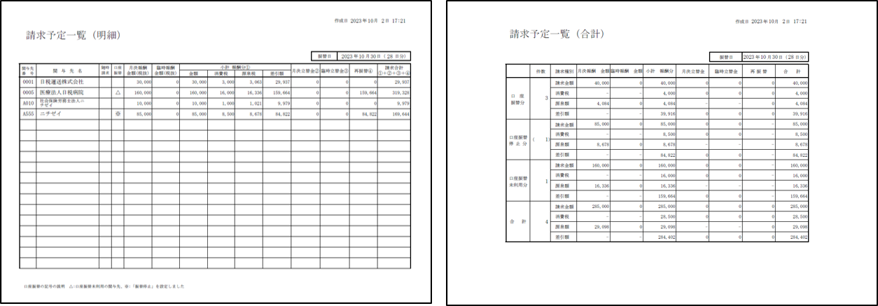 ・[ダウンロード(CSV形式)]ボタン:「請求予定一覧」の明細のみ出力 ・[ダウンロード(PDF形式)]ボタン:「請求予定一覧」の明細と合計を出力