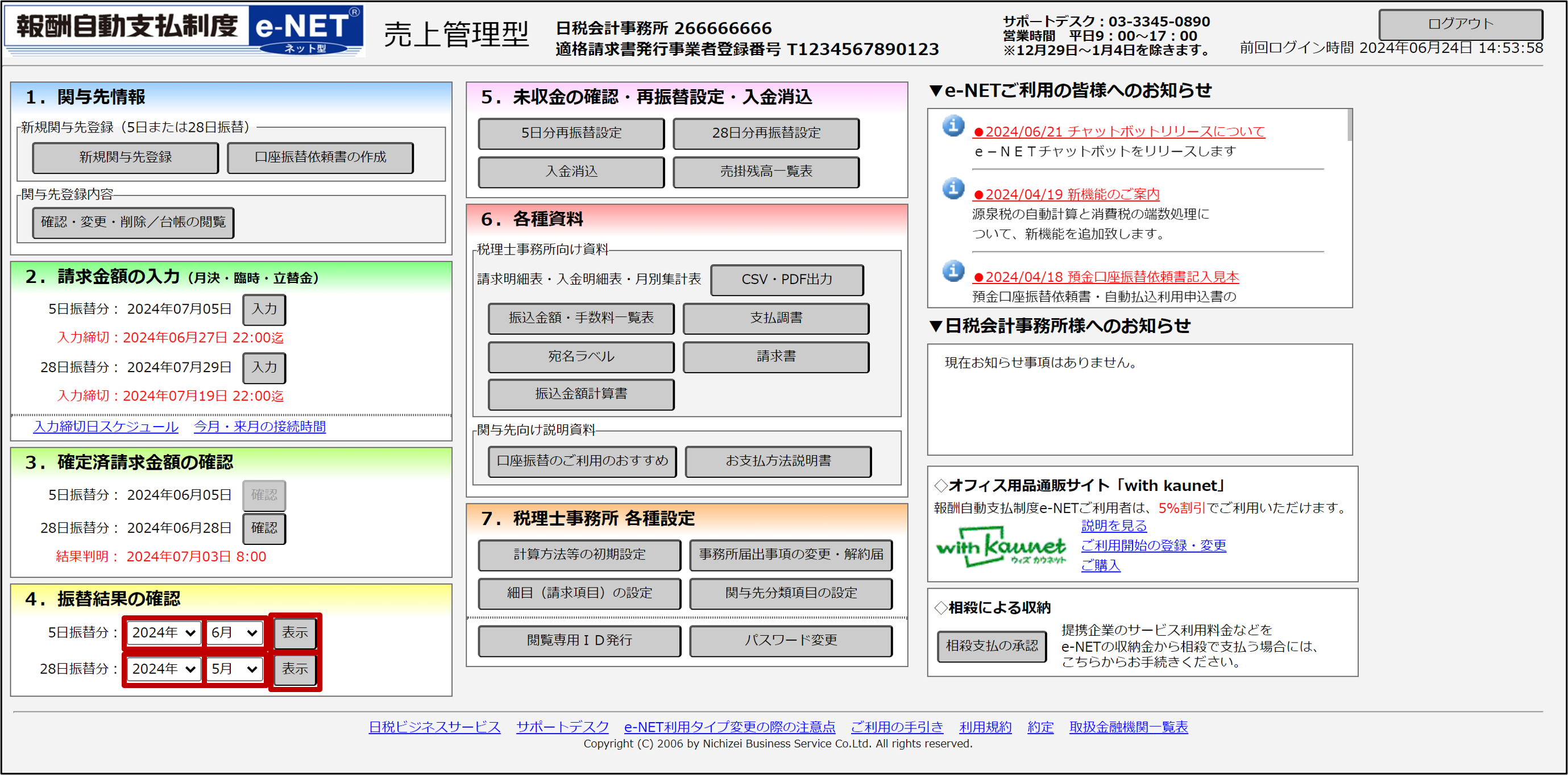 [メニュー]画面で[振替結果の確認]欄で日付を選択し、[表示]ボタンをクリックし、[振替結果判明]画面を開きます。