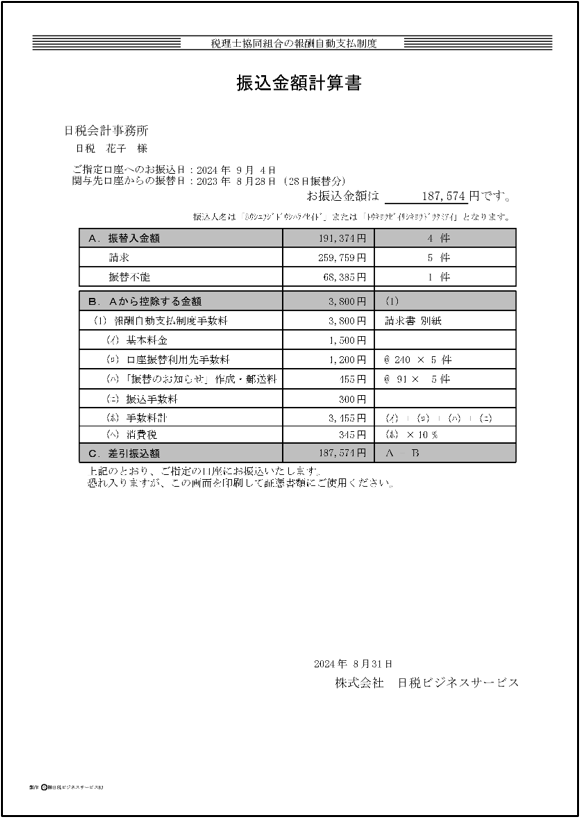 [振替結果判明]画面で「関与先別明細」タブをクリックし、[振込金額計算書(PDF形式)]ボタンをクリックします。『振込金額計算書』が出力できます。
