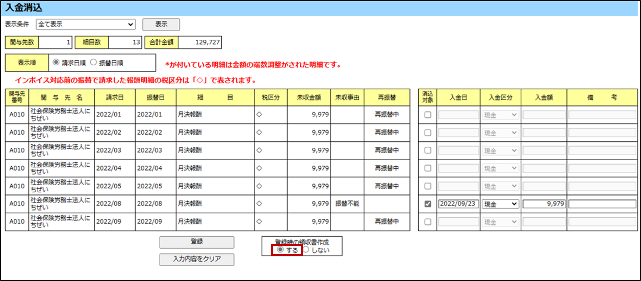 [入金消込]画面で「消込対象」欄のチェックボックスにチェック「レ」を入れます。入金日、入金区分、入金額、備考が自動で表示されます。必要に応じて、「入金日」「入金区分」「入金額」「備考」を変更します。表示項目の詳細は「12.3 入金消込」を参照してください。