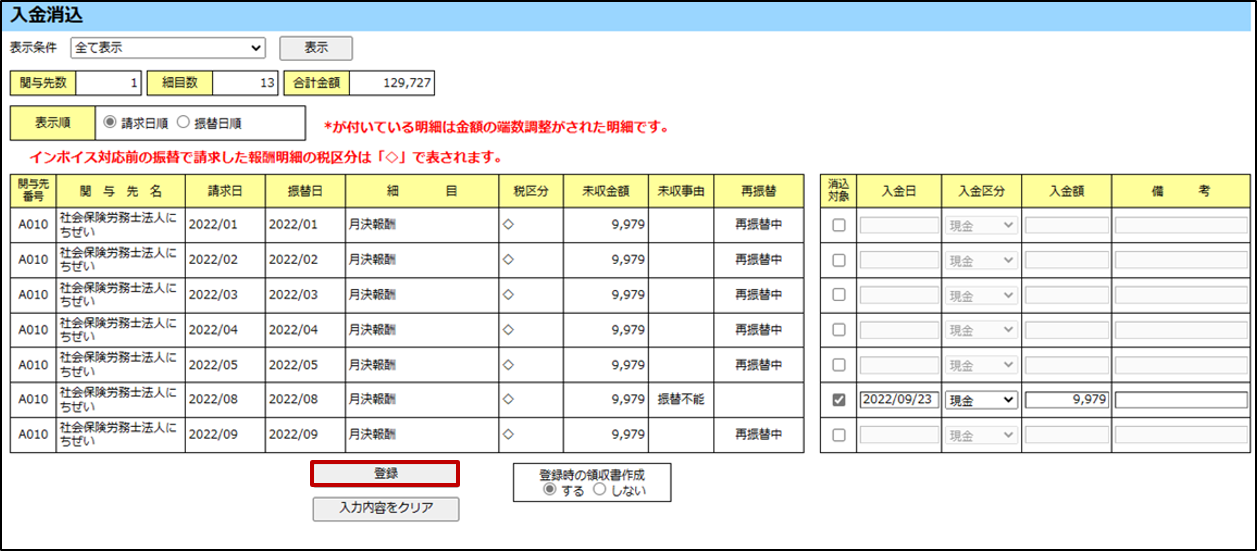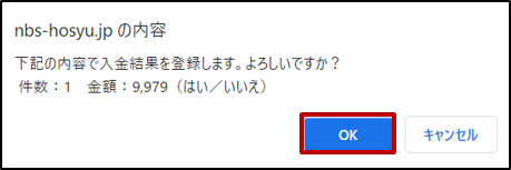 登録確認のメッセージが表示されます。[OK]ボタンをクリックします。入金消込されます。