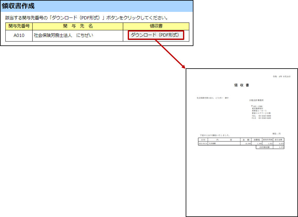 [登録時の領収書作成]欄で「する」を選択した場合、[領収書作成]画面が表示されます。該当する関与先番号の[ダウンロード(PDF形式)]ボタンをクリックすると、『領収書』が出力されます。