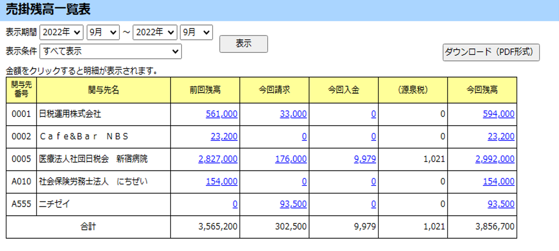 「売掛残高一覧表」で、すべての関与先の売掛金を一括で把握することができます。