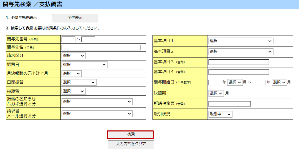 [関与先検索/支払調書]画面で、必要な条件のみ入力し、[検索]ボタンをクリックします。すべての関与先を表示する場合は、検索条件を入力せず、[全件表示]ボタンをクリックします。