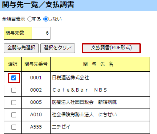 [関与先一覧/支払調書]画面で、支払調書をダウンロードする関与先のチェックボックスにチェック「レ」を入れ、[支払調書(PDF形式)]ボタンをクリックします。すべての関与先の『支払調書』を出力する場合、[全関与先選択]ボタンをクリックします。