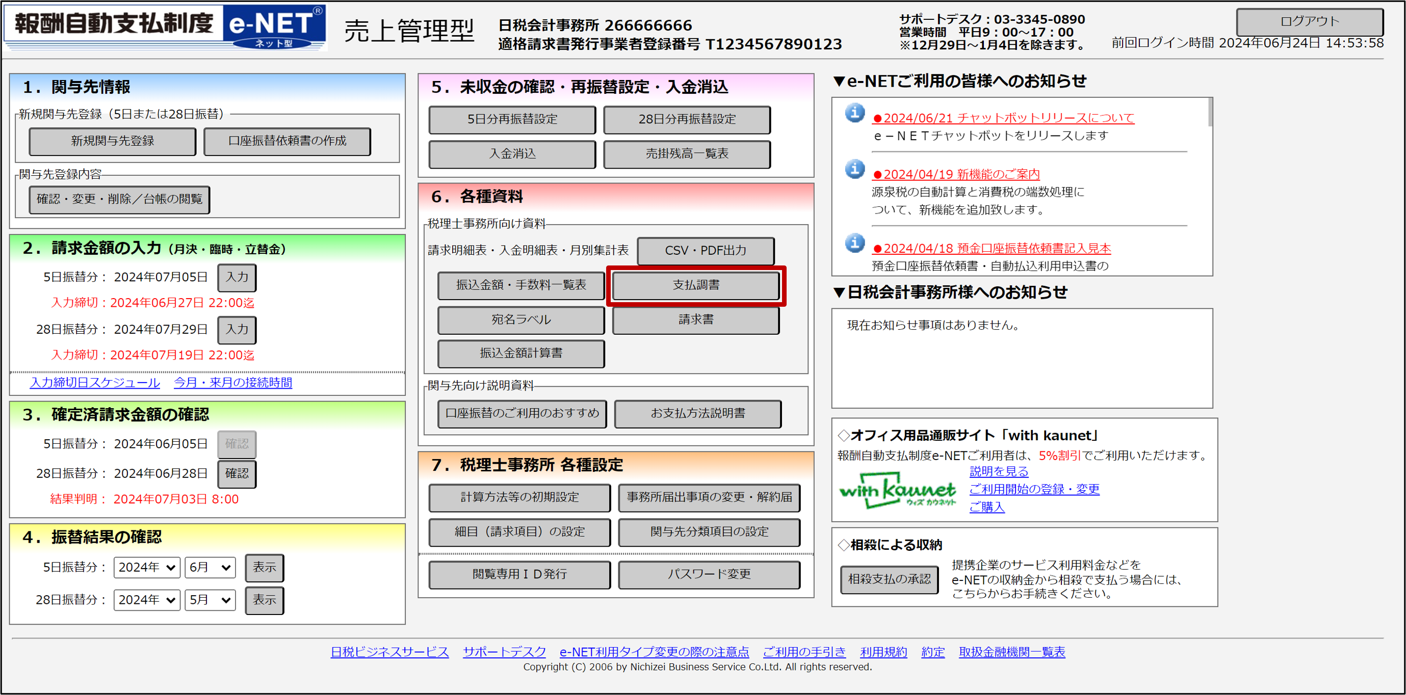 [メニュー]画面で[支払調書]ボタンをクリックします。