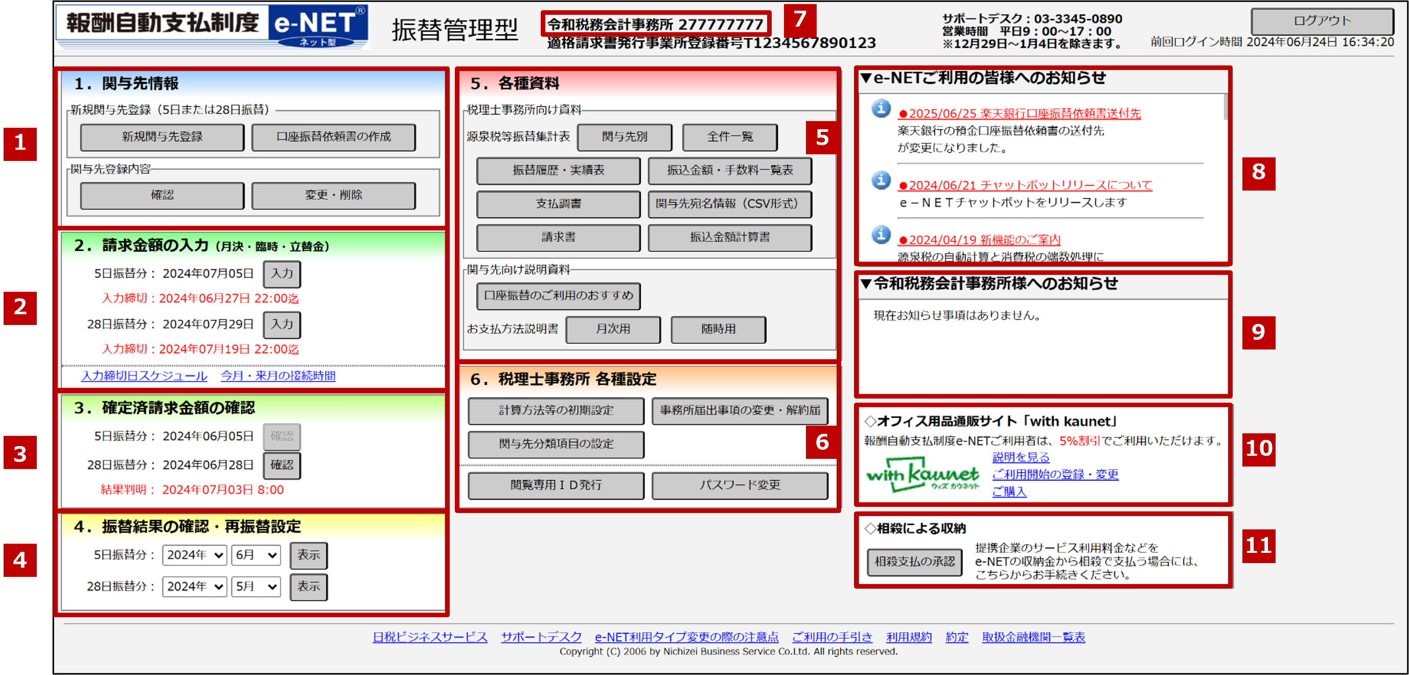 | 利用者名・ユーザー番号・適格請求書発行事業者登録番号 | e-NET振替管理型の利用者名、ユーザー登録番号、適格請求書発行事業者登録番号が表示されます。 サポートデスク問い合わせ時にはユーザー登録番号を伝えてください。 |