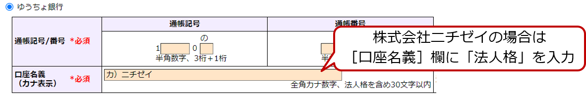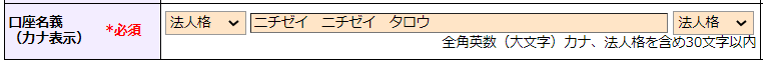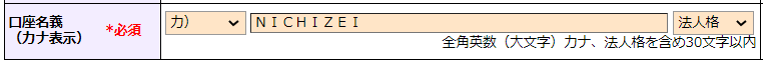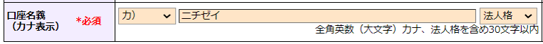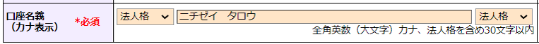 | 口座名義(カナ表示) | 法人の場合は、社名前後の「法人格」を選択し、口座名義(全角英カナ大文字、数字 30字以内)を入力します。肩書・代表者名の入力は不要です。 | ||