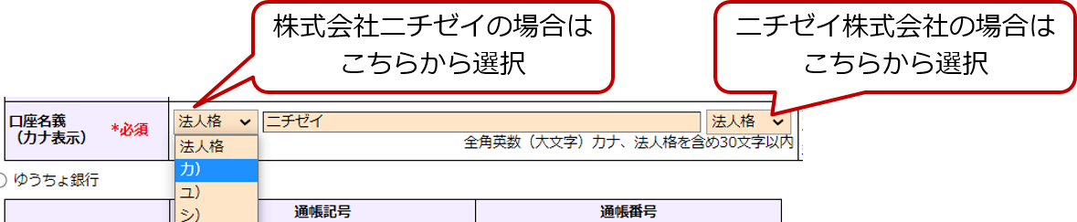 プルダウンメニューに該当の法人格がない場合は[口座名義]欄に「法人格」も入力します。