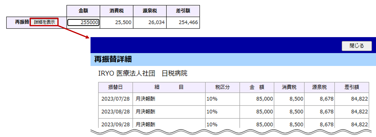 合計の[再振替]欄内にある[詳細を表示]ボタンをクリックすると、[再振替詳細]画面が表示されます。