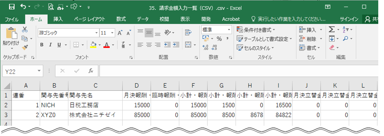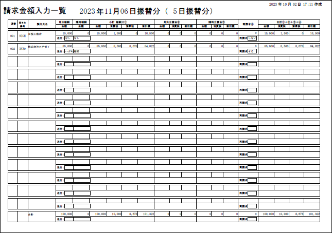 請求金額入力一覧の出力方法について説明します。 [請求金額の入力]画面で[Excel用CSVデータ]ボタンまたは[印刷用PDFデータ]ボタンをクリックすると、「請求金額入力一覧」が出力できます。