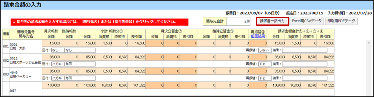 指定した関与先の『請求書』を一括で出力できます。
