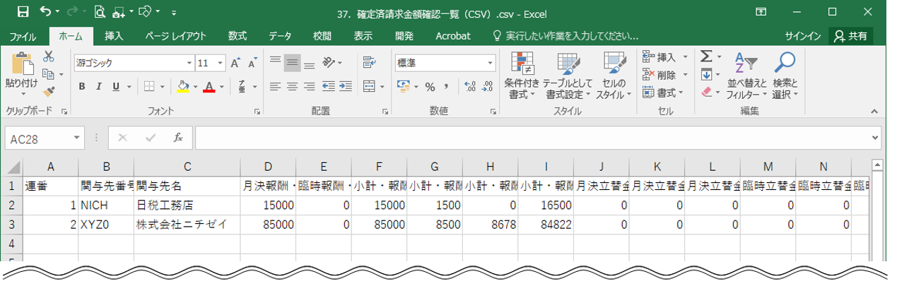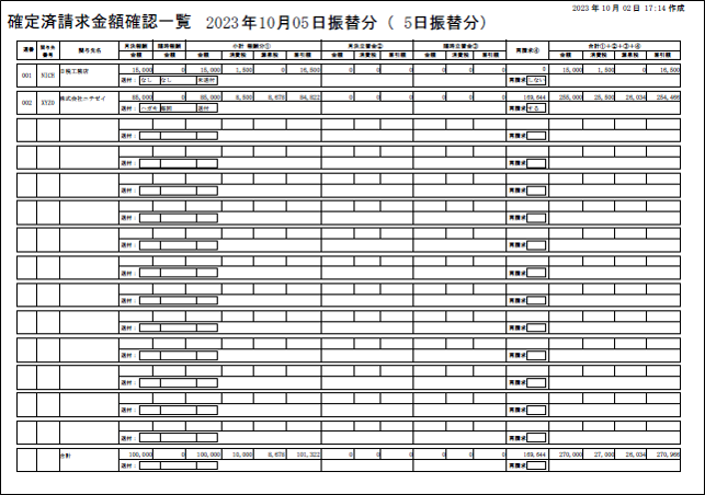 [確定済請求金額の確認]画面で[Excel用CSVデータ]ボタンまたは[印刷用PDFデータ]ボタンをクリックすると、「確定済請求金額確認一覧」が出力できます。