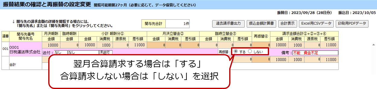 再振替の設定について説明します。 口座振替ができなかった関与先は、[振替結果の確認と再振替の設定変更]画面の[備考:]欄に不能理由が表示されます。次回の口座振替で自動的に合算請求する場合、[再振替:]欄で「する」を選択し、再振替を設定します。当月の振替不能分は翌月自動的に合算請求されます。