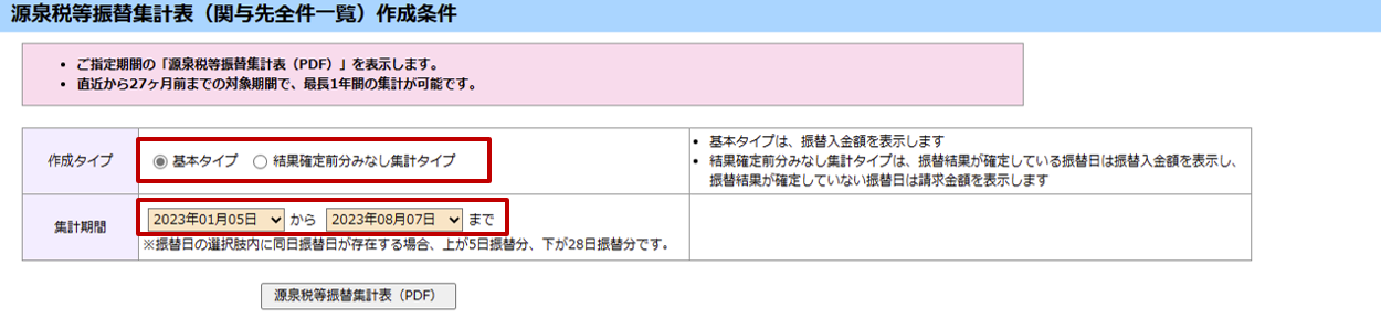 [源泉税等振替集計表(関与先全件一覧)作成条件]画面で、「作成タイプ」「集計期間」を選択します。