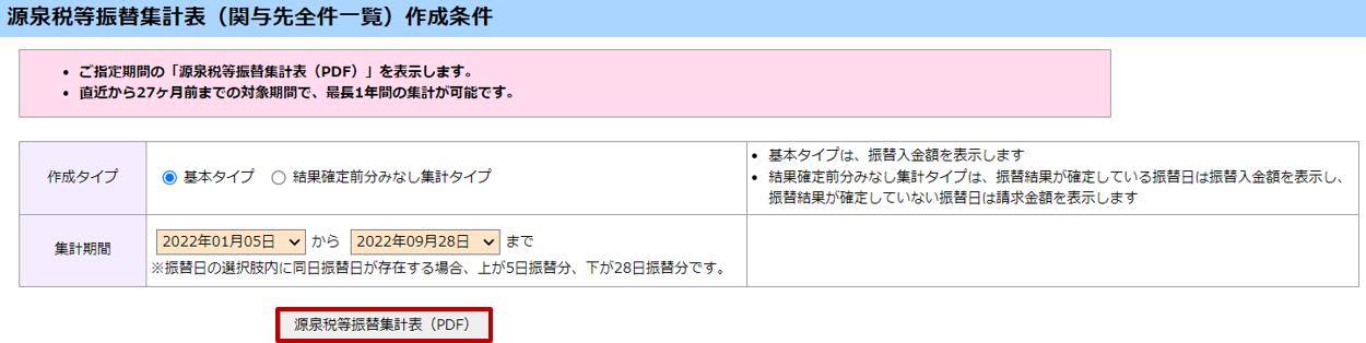「源泉税等振替集計表(全件一覧)」の確認方法について説明します。