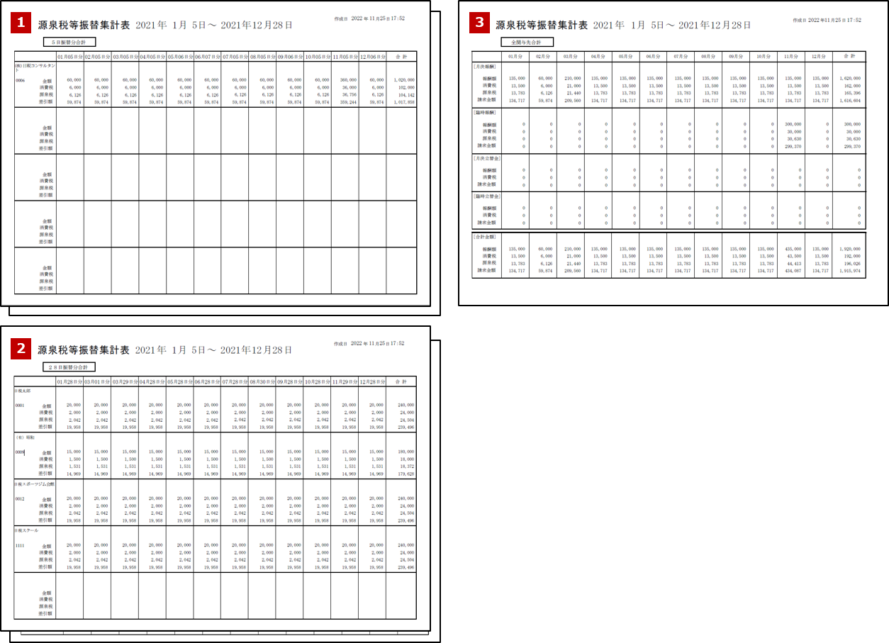 [源泉税等振替集計表(関与先全件一覧)作成条件]画面の「作成タイプ」で「結果確定前分みなし集計タイプ」を選択した場合、振替結果が確定している振替日は「振替入金額」が表示され、振替結果が確定していない振替日は「請求金額」が表示されます。