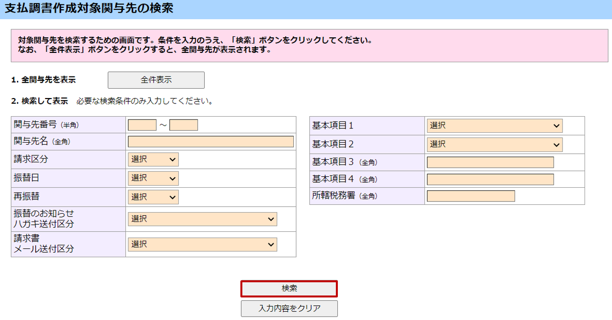 [支払調書作成対象関与先の検索]画面で、必要な条件のみ入力し、[検索]ボタンをクリックします。すべての関与先を表示する場合は、検索条件を入力せず、[全件表示]ボタンをクリックします。