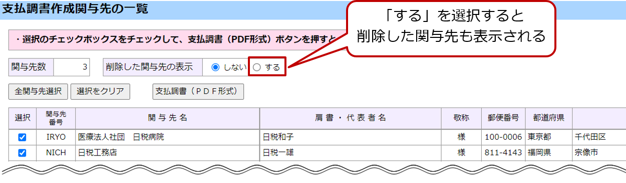 削除した関与先も表示する場合は、[支払調書作成関与先の一覧]画面の[削除した関与先の表示]欄で「する」を選択します。