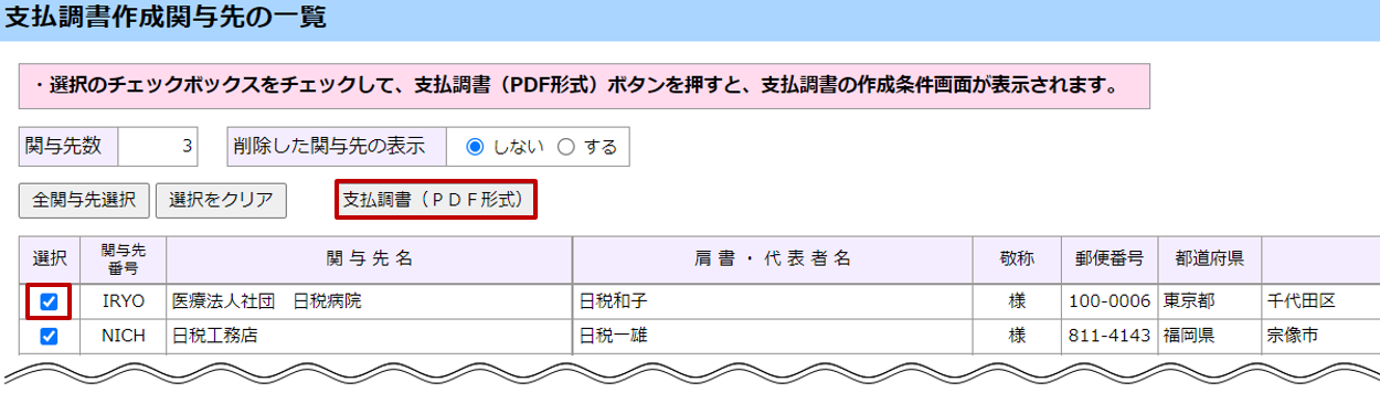 「支払調書」をダウンロードする関与先のチェックボックスにチェック「レ」を入れ、[支払調書(PDF形式)]ボタンをクリックします。