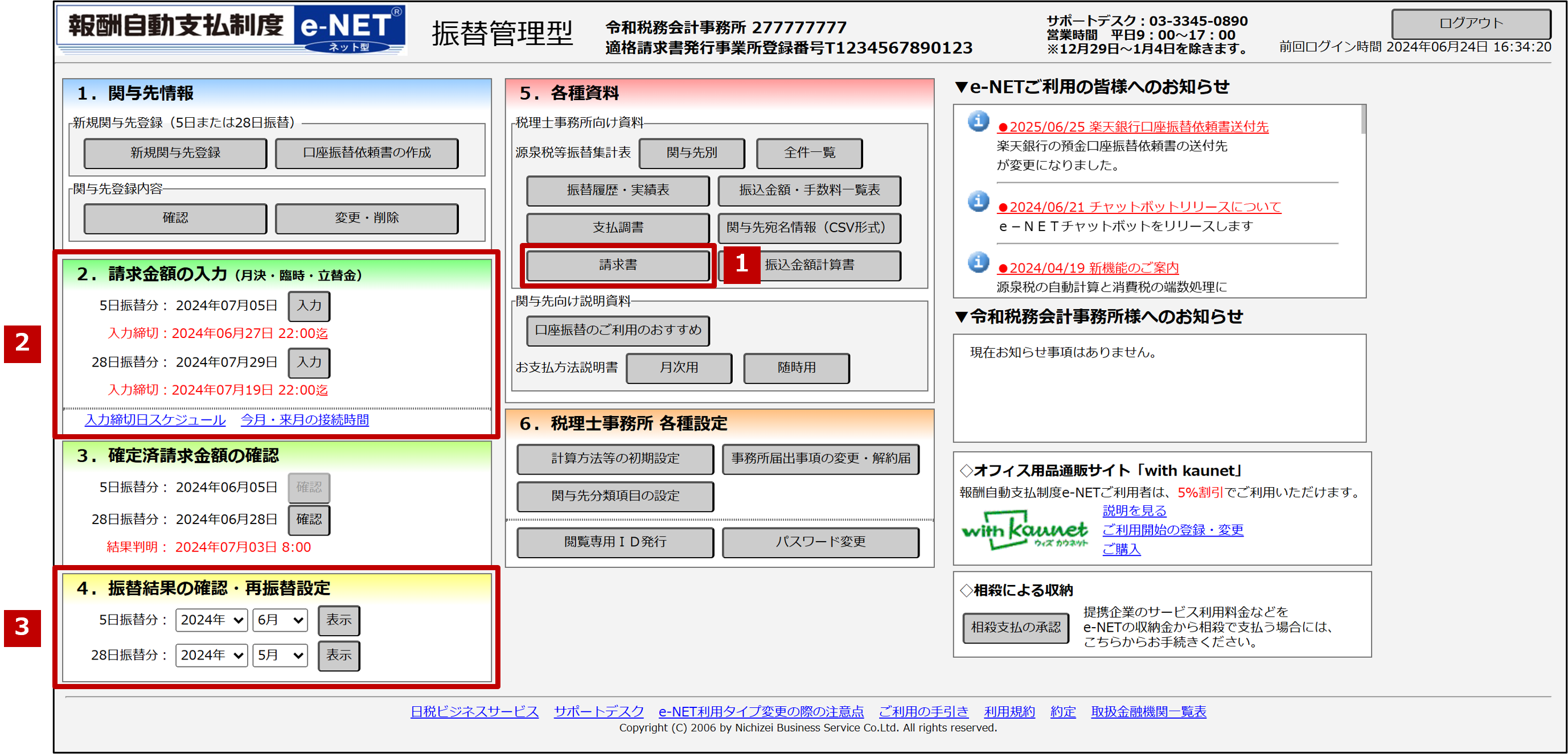 | 振替結果の確認・再振替設定 | 振替結果判明 | 過去請求書出力 |