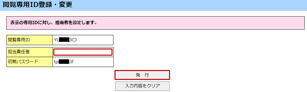 [閲覧専用ID登録・変更]画面で表示された「閲覧専用ID」と「初期パスワード」を確認します。[担当責任者]欄に「担当責任者名」を全角で入力し、[発行]ボタンをクリックします。