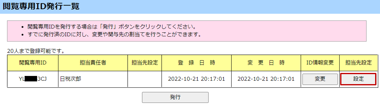 [閲覧専用ID発行一覧]画面で[担当先設定]欄の[設定]ボタンをクリックします。
